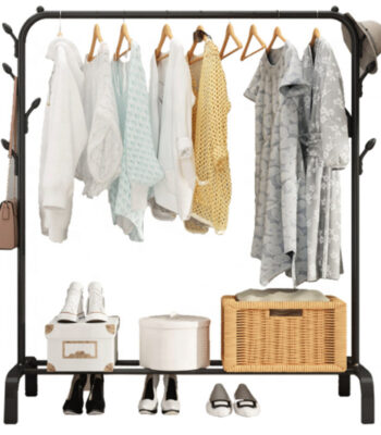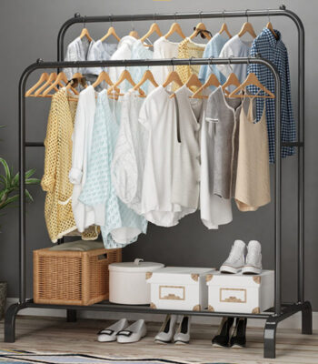 Perchero de pie doble y minimalista para organizar y secar al aire más prendas en menos espacio. Estructura metálica resistente, dos barras para el doble de capacidad, montaje rápido y diseño que combina con cualquier ambiente.