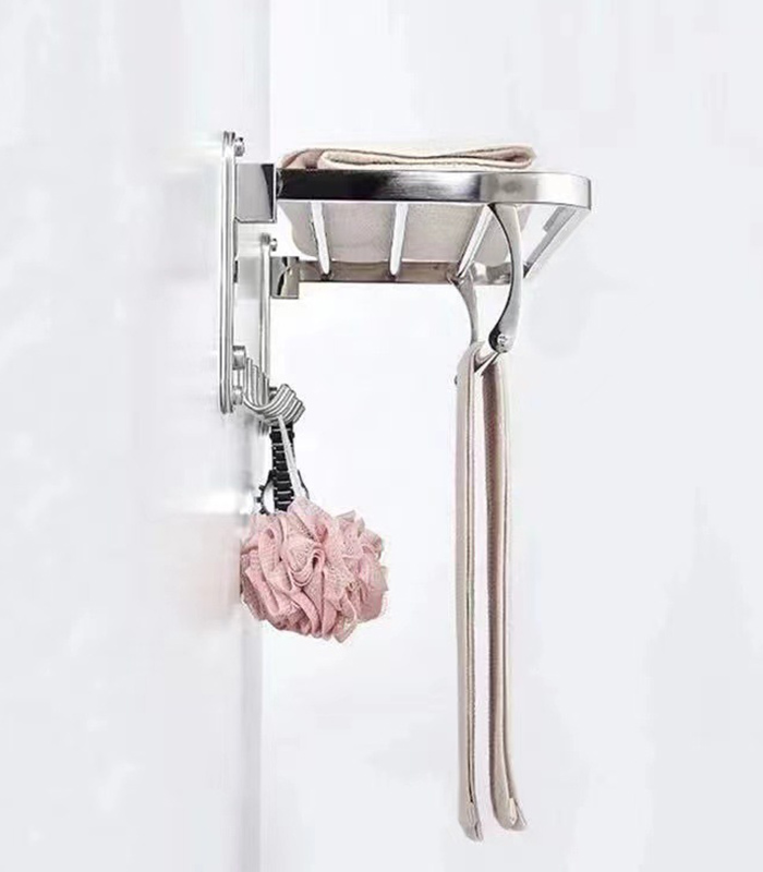 • 3 en 1: estante + barra para toalla + ganchos para accesorios.