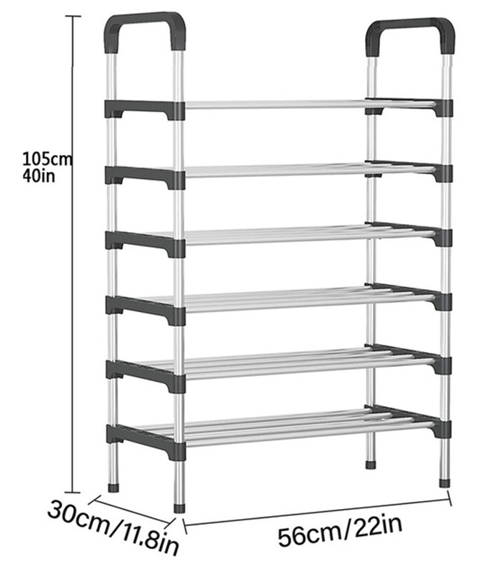 Zapatero metálico de 6 niveles con diseño abierto y ligero. Mantén tu calzado ordenado y bien ventilado en la entrada, clóset o dormitorio. Tubos plateados con conectores negros y asas superiores para moverlo con facilidad. Montaje rápido y limpieza sencilla.