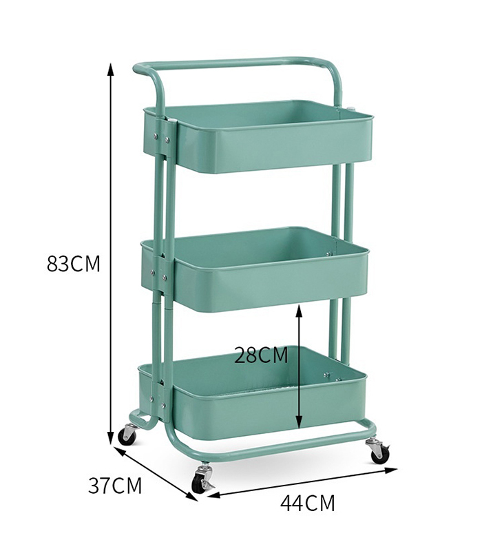Carrito metálico de 3 niveles con rueditas, ideal para ordenar cocina, baño, oficina o lavadero. Medidas: Alto 83 cm, Ancho 44 cm, Profundidad 37 cm. Canastos profundos, fácil de mover y armado rápido. Color verde menta.