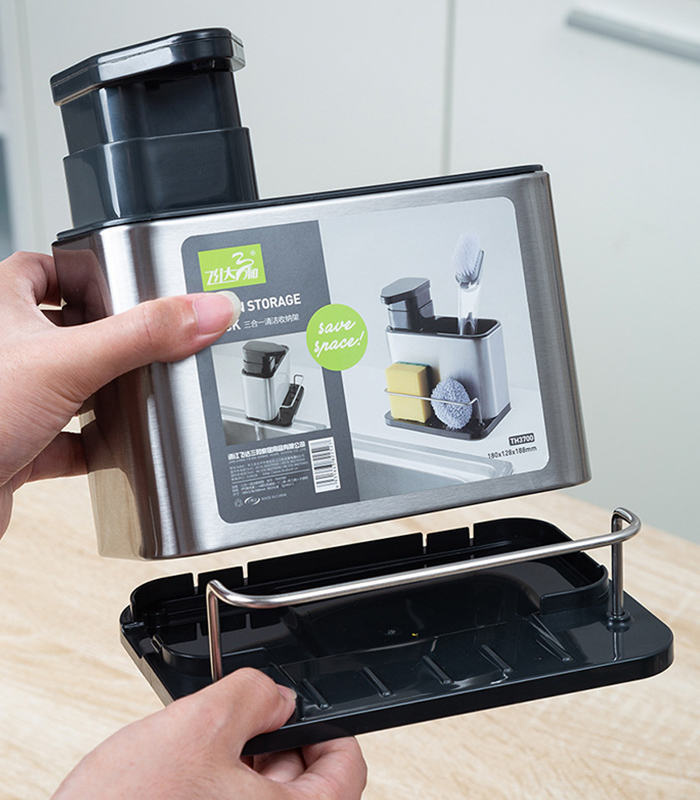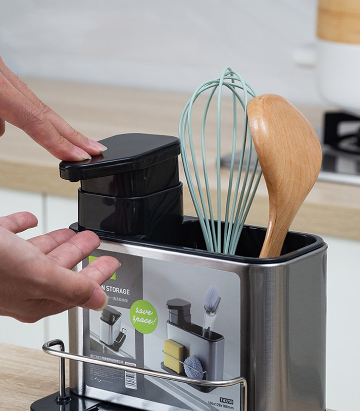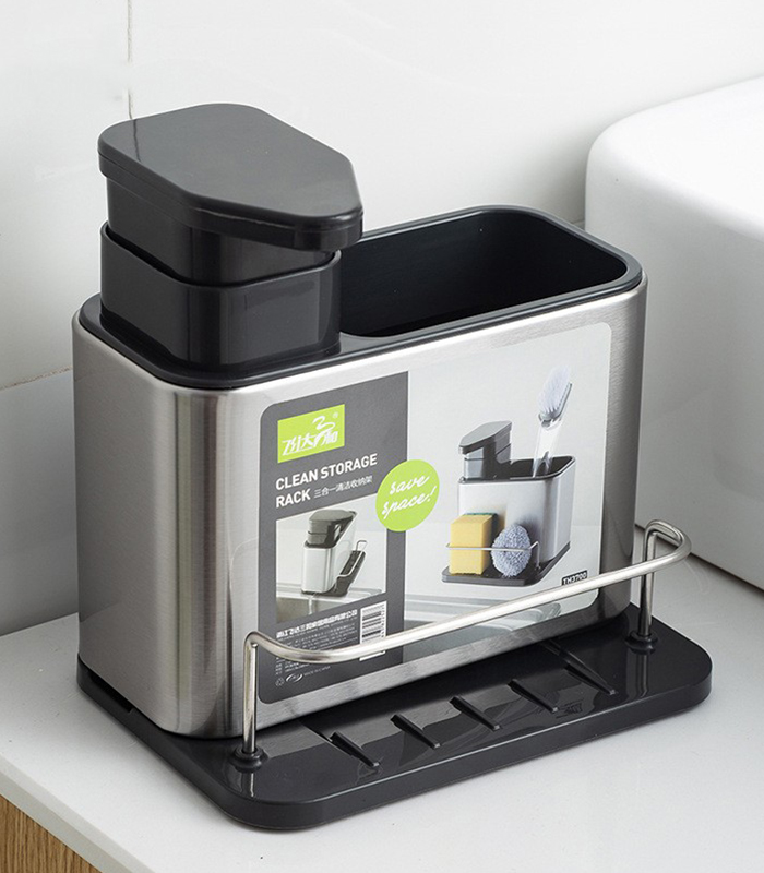 • 3 en 1: dosificador + porta-esponja/cepillo + bandeja escurridora.